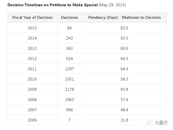 表1 关于特殊审查途径的授权、驳回数据表[5] 表2 关于特殊审查途径的请愿书时间表[6] 以上我们共介绍了两种加速审查程序,但相对来说,这是较不常用的加速方法,关于更为常用的专利申请高速公路(PPH)和优先审查(Track One)两种加速审查程序,七星天将在本文下篇中整理好干货与大家分享,申请人可以根据其具体的申请条件和实际情况来决定。 对于申请人而言,美国可以算是重要的海外市场之一,还需选择合适的加速审查方式才行,适当情况下可选择合适的代理机构协助申请人完成此程序。(本文由七星天整理,转载请注明出处) 如有任何疑问,也欢迎与七星天进一步讨论。 [1]Traditional Total Pendency (months), https://www.uspto.gov/dashboards/patents/main.dashxml,访问时间:2019年02月14日 [2]具体参见 37 CFR 1.102 (https://www.bitlaw.com/source/37cfr/1_102.html)以及 MPEP 708.02(https://www.uspto.gov/web/offices/pac/mpep/s708.html) [3]此处需要说明的是,这样的分类不是非常精准,其主要原因是USPTO把两种概念(Accelerated Examination 和 Make Special)颇有混淆;详情可见 MPEP 708.02及 37 CFR 1.102。严格说来,此处所说的Accelerated Examination 中使用的具体程序也叫 Petition to Make Special,但基于年龄/健康的 Make Special 又和 Accelerated Examination 中的各项要求非常不同,所以此处把基于年龄/健康的 Make Special 单列出来 [4]信息参考来源:MPEP 708.02 [5]数据来源:https://www.uspto.gov/patent/initiatives/accelerated-examination#heading-1 [6]数据来源:https://www.uspto.gov/patent/initiatives/accelerated-examination#heading-1 七星天更多精彩文章: Bypass还是371?基于PCT递交美国专利申请该用什么途径 了解更多最新的、专业权威的知识产权相关资讯,请扫描下方二维码关注“七星天”官方微信公众号! |